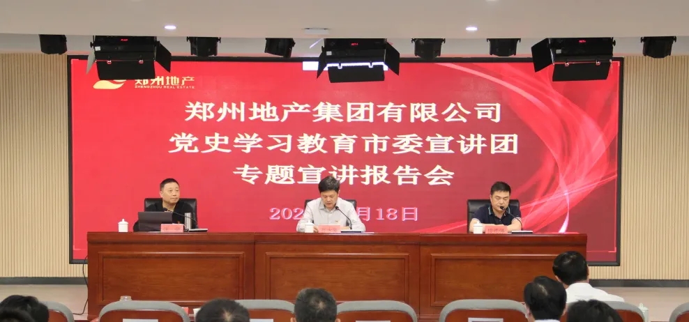 為持續(xù)推進(jìn)黨史學(xué)習(xí)教育走深走實(shí),5月18日上午,鄭州市委宣講團(tuán)走進(jìn)鄭州地產(chǎn)集團(tuán),在集團(tuán)301多功能廳開展黨史學(xué)習(xí)教育專題宣講報(bào)告會(huì)。報(bào)告會(huì)由鄭州市委宣講團(tuán)成員、鄭州工程技術(shù)學(xué)院馬克思主義學(xué)院副教授張豪主講,市國(guó)資黨史學(xué)習(xí)教育第二巡回指導(dǎo)組組長(zhǎng)、四級(jí)調(diào)研員段德強(qiáng),指導(dǎo)組成員張?jiān)娪辍㈥愊殪车綍?huì)巡聽旁聽,地產(chǎn)集團(tuán)領(lǐng)導(dǎo)班子、總部全體員工,各子公司支部書記、黨建部門負(fù)責(zé)人等共計(jì)150余人參加現(xiàn)場(chǎng)報(bào)告會(huì),各子公司員工共計(jì)170余人通過線上直播進(jìn)行觀看,會(huì)議由地產(chǎn)集團(tuán)黨委書記、董事長(zhǎng)萬永生主持。