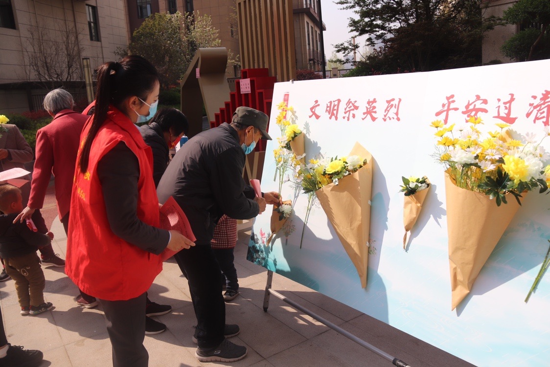 入口處的英烈追思展板吸引了居民們的注意,展板上牛皮紙制作的花束中已經(jīng)放入了不少黃色或白色的小菊花。支部黨員志愿者魯照宇向居民們介紹:“由于疫情原因,不建議集聚在烈士陵園祭祀,我們倡導(dǎo)文明祭祀、綠色祭祀,希望以這種特殊的方式祭奠革命先烈,營造良好社會(huì)風(fēng)尚。”居民們拿過一支支小菊花親手粘貼在追思展板上表達(dá)對(duì)英烈的敬意,并寫下追憶英雄烈士的留言。